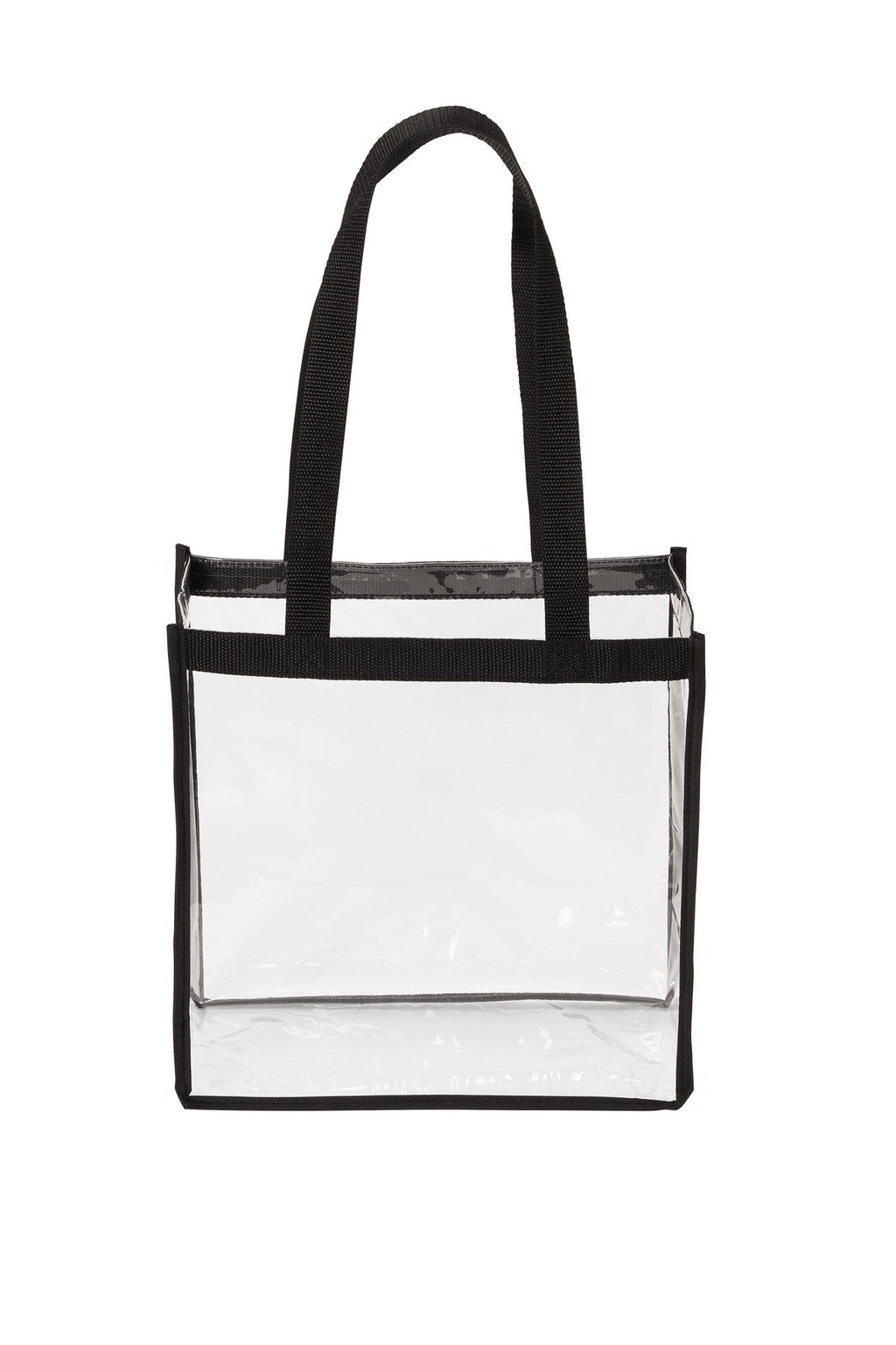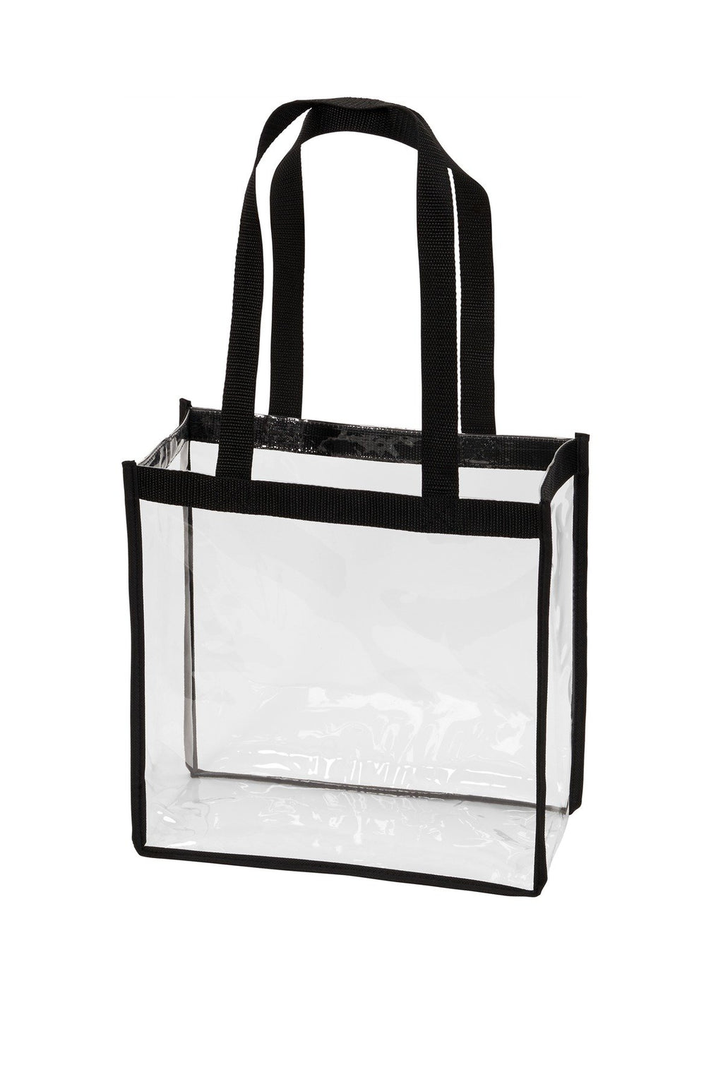 This see-through tote meets the policies for stadiums concerts and events that allow clear bags. Clear PVC Polyester webbing handles and trim Dimensions: 11.75'h x 11.75'w x 5.75'd; Approx. 794 cubic inches Note: Bags not intended for use by children 12 and under.